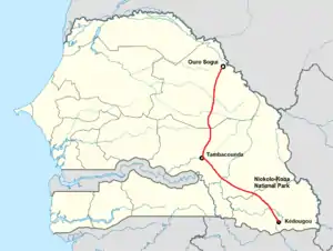 The road runs in a southerly direction from Ouro Sogui to Tambacounda where it crosses the N1 road before heading south-east, via the Niokolo-Koba National Park, to Kédougou on the borders of Mali and Guinea.