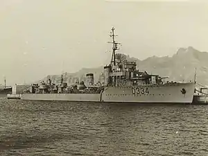 The five destroyers carried out patrols to defend Portugal's neutrality during the Second World War. Their anti-aircraft armament was revised during 1942–1943, with the 40 mm guns and one of the banks of torpedo tubes replaced by six 20 mm cannon.[4][1] The ships were refitted by Yarrow from 1946 to 1949, with the machinery refurbished, anti-aircraft armament again revised to three Bofors 40 mm gun in powered mounts and three 20 mm cannon. Sonar and British Type 285 and Type 291 radars were fitted.[5]