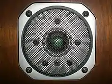 The tweeter is a beryllium deep dome design with a diffuser ring and protective wire net. It operates the frequencies 6 kHz to 20 kHz (and capable of much higher). The dome size is 3 cm (1-3/16") and it weighs only 0.028 grams. Similar to the midrange but smaller, it also has a tangential surround made of cloth coated with resins. The magnet is 18,800 Gauss and 34,000 Maxwell. The frame is diecast aluminum.