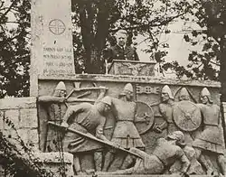 The NS monument, or Nasjonal Samling monument, was a Norwegian 9-meter-tall obelisk made from quartzite shale from Vågå. It was erected at Stiklestad in Nord-Trøndelag county in July 1944 and inaugurated by collaborationist Minister-President Vidkun Quisling.[1] Since 1934 Quisling's Nasjonal Samling party had held a number of rallies at Stiklestad, in an attempt to link the party to Norway’s historic past.[2] The NS monument took the place of the Olav's monument erected in 1807 in remembrance of Olav Haraldsson, who later became King Olaf II of Norway and received the epithet "Olaf the Holy." The Olav's monument was consequently placed in storage at Verdalsøra.