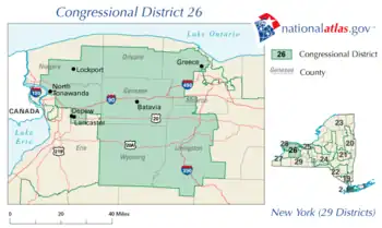 New York's 26th congressional district is a congressional district for the United States House of Representatives in Western New York. It includes parts of Erie and Niagara counties. The district includes the cities of Buffalo, Lackawanna, Niagara Falls, Tonawanda, and North Tonawanda.