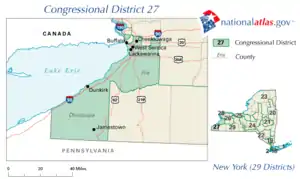 New York’s 27th congressional district was a congressional district for the United States House of Representatives in western New York. It included all of Orleans, Genesee, Wyoming, and Livingston counties and parts of Erie, Monroe, Niagara, and Ontario counties. The district contained most of the eastern and southern suburbs of Buffalo, most of the southern suburbs of Rochester, as well as large rural areas to the east and south. The seat was last occupied by Republican Chris Jacobs, who won a special election on June 23, 2020.[1][2] Previously, it had been vacant from October 1, 2019, when Republican incumbent Chris Collins resigned after pleading guilty to charges of insider trading.[3]