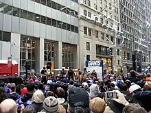 The marching band is the premier ensemble of the NYPD Band. It is an annual participant in the Columbus Day parade and the Macy's Thanksgiving Day Parade. It also performed at events such as the National Police Parade.[3] It also took part in events such as the 2011 edition of the Quebec City International Festival of Military Bands, which included a performance of God Bless America with the Alexandrov Ensemble of the Russian military.[4] In May 2018, the band jointly performed with the Alexandria Ceremonial Police Orchestra from Israeli film The Band's Visit.[5][6]
