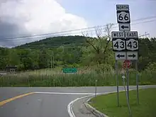 New York State Route 66 (NY 66) is a state highway in the Capital District of New York in the United States. The route begins at an intersection with US 9 and NY 23B in the Columbia County city of Hudson and ends at a junction with NY 2 in the Rensselaer County city of Troy. While both Hudson and Troy are located on the Hudson River, NY 66 follows a more inland routing between the two locations to serve several rural villages and hamlets, including Chatham and Sand Lake. NY 66 overlaps with U.S. Route 20 (US 20) and NY 43, two regionally important east–west highways, in Nassau and Sand Lake, respectively.