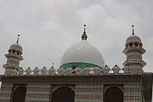 The Dargah (shrine) of Nadir Ali Shah is situated within the premises of his dervish lodge, located southeast of the Shrine of Lal Shahbaz Qalandar. The iconic white dome is highlighted by a green ceramic tile border.[40] The dome, hemispherical in shape, crowns a square edifice adorned with four minarets, all embellished with mosaic ceramic tilework. A harmonious array of mosaic tilework on the exterior walls forms horizontal lines of yellow, green, red, black, and blue tiles against a white background, extending from bottom to top. This arrangement evokes a sense of pure delight.[20] Inside the shrine, intricate glasswork graces the lofty ceiling and dome. Turquoise ceramic tiles and delicate glasswork adorn the interior walls, while Quranic verses are elegantly carved into the glasswork on the northern wall. A significant number of people visit the shrine daily to pay tribute to Nadir Ali Shah.[19]