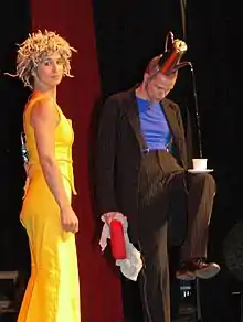 Born 1968 in Zürich, Nadja Sieger attended a Gymnasium in Zurich. Before she received the baccalaureate in 1988 (Maturität Typus B).[1] She has been working as a street performer with Urs Wehrli, and is acting since 1987 as Nadeschkin. In 1989 Nadia Sieger toured with Karls kühne Gassenschau.[2] In 2004 she featured in the Swiss television film Fremde im Paradies, 2005/2006 as co-author in a film not yet shown, as director in the independent theater scene and since 2005 from time to time as Jazz singer (Swing Time Dance ArchestrA, Big Band Connection and Swingtime Pocket Archestra).[1] On 22 December 2010 Nadja Sieger's son was born.[3][4][5] Just for fun, Nadja Sieger is member of the Lindy Hop Dancer. In 2013 Nadja Sieger acted as voice actress in the Swiss-German animation film S'Chline Gspängst (The Little Ghost).[3] She wrote as columnist in the Swiss newspaper Berner Zeitung.[6] In October 2014 Nadja Sieger was also involved as producer of the comedians Starbugs and director of their 2014/2015 tour.[7] On 29 September 2016 the duo started its 30-year celebration tour.[8]