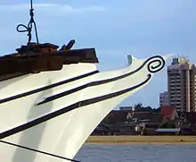 All over South East Asia, in Burmese, Thai, Vietnamese, Khmer culture, Nagas are found in various form, half snake, half dragon. For the pre-Islamic Malays the Naga was a deity living in the sea and was held in great esteem by the seafarers. Sacrifices were offered to ask for an auspicious journey and frequently the bow of their craft was adorned with a figurehead of a carved Naga. This detailed carving was reduced to a stylised carving in later times due to the strict picture ban of the Islam. The figurehead of a Malay pinas is called gobel,[4][10] with the elements of the old Naga shining through.