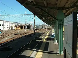 The station has a single side platform and an island platform on a head shunt servicing three tracks, with a level crossing at one end. The station building, located at the end of one of the platforms, has automated ticket machines, and automated turnstiles, which accept the LuLuCa smart card ticketing system as well as the PiTaPa and ICOCA IC cards.