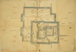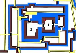 Nagaoka Castle was a flatland-style castle with two central baileys, the Honmaru (本丸) and the Ni-no-Maru (二の丸), both surrounded by a moat. These were in turn surrounded by the San-no-Maru (三の丸) and Tsume-no-Maru (詰の丸 ) Baileys, and the Minami-Kuruwa (南曲輪 ) and Nishi-Kuruwa (西曲輪) forecourts. This outer ring of defences was also surrounded by a moat. The castle had only earthen ramparts, with yagura watchtowers at various locations, and there was no donjon in the central bailey.