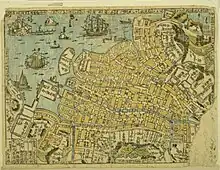Nagasaki-e (Japanese: 長崎絵) is a genre of ukiyo-e woodblock prints, produced in Nagasaki during the Edo period, that depict the port city of Nagasaki, the Dutch and Chinese who frequented it, and other foreign curiosities such as exotic fauna and Dutch and Chinese ships. They were mostly produced for merchants who traveled to Japan on business.[1] Japanese people also bought such prints as they were curious about foreigners, with whom they couldn't meet themselves. Nagasaki-e print were also sold in Edo, Osaka, and provinces. Nagasaki was the only port that foreigners were allowed to visit in Tokugawa time, between 1641 and 1859.[1][2]
