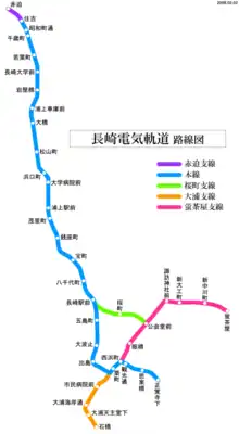 - Sakuramachi Branch Line (桜町支線): Nagasaki-Ekimae — (Sakuramachi) — Shiyakusho (City Hall)