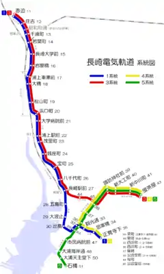 - ■ Route 1 (1系統): Akasako — Sumiyoshi — Nagasaki-Ekimae — (Dejima) — Shinchi Chinatown — Nishihamanomachi — Sōfukuji