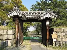 The Nishinomaru Enokida Gate (西之丸 榎多門 Nishinomaru enokidamon) is used today as the main entrance (正門 seimon) to the castle. The original structure was built as a tower gate (yagura mon). A smaller front gate to the south was called Kabuki Gate (冠木門 Kabukimon) and a rectangular-shaped barbican tower was built on top of the surrounding stone walls. Together the structures formed a square called Masugata Koguchi (桝形虎口) where the enemy could be encircled. The gate formed an important part of the castle's defenses, being the main portal into the western Nishinomaru (西之丸) enceinte.