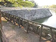 Located at the east gate is a very large stone built into the wall. According to legend, Katō Kiyomasa, a renowned general and castle engineer, hauled this large stone that was later named after him to the castle.[15] But it is probable that this part of the castle's foundation was constructed by Kuroda Nagamasa. Feudal lords who were ordered to build the stone walls carved their marks on their stones to distinguish them from the stones of other lords.