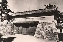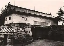 The whole gate structure was built around 1612. The barbican tower was damaged in the earthquake of 1891, and later completely removed. Detailed measurements and architectural drawings were made in the early Shōwa era.[31] The first gate burnt down in the air raid of 1945, leaving only the stone basis and the smaller second gate. Since the second gate is in its original state, it has been designated an Important Cultural Asset.[15]