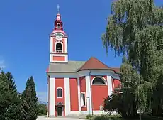 The local church is dedicated to Saint Peter. It is a Baroque structure and was renovated after a fire in 1843. The altar painting is by Leopold Layer (1752–1828), and the Stations of the Cross were painted by Janez Wolf (1825–1884).[4]