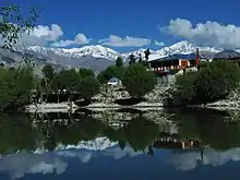 Nako Lake is a high altitude lake in the Pooh sub-division of the Kinnaur district of the state of Himachal Pradesh in India. It forms part of the boundary of Nako village, and is named after it. It is about 3,662 metres (12,014 ft) above sea level. The lake is surrounded by willow and poplar trees. Near the lake there are four Buddhist temples. Near this place there is a foot-like impression ascribed to the saint Padmasambhava. Several miles away there is a village called Tashigang around which there are several caves where it is believed that Guru Padmasambhava meditated and gave discourse to followers. There is a waterfall nearby which has snow water falling like a river of milk. Legend says that it is a heavenly realm of fairies. In one of the caves you are still able to see the live footprints of these fairies or other demigods. It is a sacred place for the people of these valleys. Followers come from as far a place as Ladhak and spiti valley.[1]