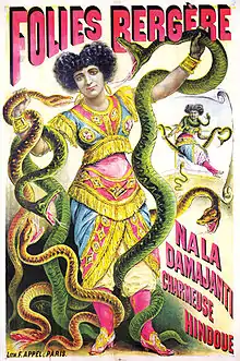 Nala Damajanti was the stage name of a late 19th-century snake charmer who toured with P.T. Barnum's circus and performed at the famed Folies Bergère in Paris. French sources identify her as Emilie Poupon (1861–?) of Nantey, Jura Department, France. Promotional posters of Nala Damajanti have been widely reproduced and are thought to have inspired one of the popular folk images of the African water spirit Mami Wata. Similar acts performing under slightly variant names such as Mala Damajaute, Nata Damajaute, and Nala Damajante are thought to have been the same person.[1]
