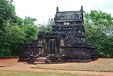Nalanda Gedige (Sinhala: නාලන්ද ගෙඩිගේ; Tamil: நாலந்த கெடிகே) is an ancient complete stone temple near Matale, Sri Lanka and its original site is considered the geographical centre of Sri Lanka.[1] The building was constructed between the 8th and 10th centuries with dravidian architecture in (Pallava style) and is believed to have been used by Buddhists.[2][3] A pillar inscription of the 9-10th century A.D. that was unearthed from the site revealed Nalanda Gedige was a Buddhist monastery.[4] Recorded in the Sinhala language, it includes a code of regulations made for the temple.[4] Also some scholars describe this building as a dravidian architecture dedicated to a Mahayana cult with pronounced Tantric learning and known as an ancient monument of possible Vajrayana (Tantric) Buddhist affinities.[5]