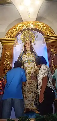 The wooden image of the Blessed Virgin Mary venerated as the Our Lady of Immaculate Conception of Namacpacan (locally known as Apo Baket[8]) in Luna was ordered from Spain by an Augustinian priest assigned in the Immaculate Conception Seminary in Vigan in 1871.[9] While on its way to Vigan, the galleon ship from Mexico carrying the image of our Lady took shelter in Darigayos due to a storm. When the sea was calm, they resumed their journey but strong winds forced them to return to the port of Darigayos.[9] The captain of the ship decided to send the image by land and it was temporarily placed in the church's convent.[1] However, the image was too heavy to be transferred onwards overland. Father Camilo Naves, an Augustinian priest, interpreted the incident as meaning that the image of the Virgin Mary wished to be enshrined in the town of Namacpacan.[1][9] Father Marcelino Ceballos, then parish priest requested to the Augustinian priest to give the image to the town.[9] Upon the agreement that the people of Namacpacan would reimburse all expenses incurred during the image's journey from Spain, the rightful owner gave the image to the town.[1][9] The people welcomed the Virgin to town with feasting, and enshrined it on an altar in the northern part of the church.