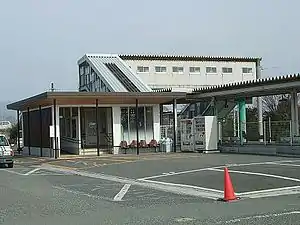 The station, which is unstaffed, consists of two staggered side platforms serving two tracks. A station building of modern concrete design houses a waiting room and an automatic ticket vending machine. There is a ramp up to the station building entrance from the access road but access to the opposite side platform is by means of a sheltered footbridge. A bike shed and parking lots for cars are provided outside the station.[2][3]