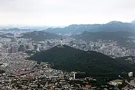 Namsan (Korean: 남산; lit. South Mountain), officially Namsan Mountain, is a 270-meter (890 ft)-high peak in Jung-gu, Seoul, South Korea. Although known as Mongmyeoksan, or 목멱산 / 木覓山 in the past, it is now commonly referred to as Mt. Namsan. It offers some hiking, picnic areas and views of downtown Seoul's skyline. The N Seoul Tower is located on top of Mt. Namsan.