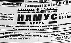 Namus was first premiered in Yerevan's Nairi Theatre on 13 April 1926.[11] On 3 October of the same year, the film was presented in Moscow.[12] A poster in Leningrad in 1926 called Namus the "biggest blockbuster of the season".[13] When asked about the film, Hamo Beknazarian said "I wanted to set the power of custom in the pillory, that stupid force of the concept of "father's honor".[11] The film had incredible success and brought Beknazarian to fame in the Soviet Union, which helped him in his later works, making him the founder of Armenian cinematography.[7]