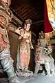 Along with nearby Foguang Temple, Nanchan Temple contains original sculptures dating from the Tang dynasty. The hall contains seventeen statues and are lined up on an inverted U-shaped dais.[4] The largest statue is of Sakyamuni, placed in the center of the hall sitting cross-legged on a sumeru throne adorned with sculpted images of a lion and demigod. Above the large halo behind the statue are sculpted representations of lotus flowers, celestial beings and mythical birds. Flanking him on each side are attendant bodhisattvas with a knee placed on a lotus. A large statue of Samantabhadra riding an elephant is at the far left of the hall and a large statue of Manjushri riding a lion is on the far left. There are also statues of two of Sakyamuni's disciples (Ānanda and Mahākāśyapa), two statues of heavenly kings and four statues of attendants.[5]