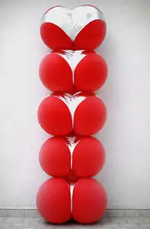 Nancy Davidson is an American artist best known for large-scale inflatable sculptures regarded as hyper-feminized abstractions of the human female form.[1][2][3][4] Bulbous and flesh-like, the sculptures resemble buttocks and breasts and employ erotic cultural signifiers in their shape and decoration.[5][6][7] Davidson's work spans art media but centers around sculpture. It is largely post-minimal in character and described by commentators as providing a feminist counterpoint to the male-dominated, minimalist sculpture of the 1960s, as well as to cultural tropes involving bodies that the works themselves invoke.[8][9][10][11] Of particular note are Davidson's use of humor and a sense of absurdity to seemingly both celebrate and subvert these tropes, inviting their investigation but without the seriousness and moralism that often accompany critical works.[12][13][14][15] Sculpture Magazine critic Robert Raczka wrote that "The confectionary color and oversize scale" of Davidson's sculpture creates a "playfully upbeat mood that allows feminist and gender issues to rise to the surface at irregular intervals, without didacticism."[14] The New Art Examiner's Susan Canning described it as establishing "a context where all can revel in the transgressive and liberating power of the grotesque."