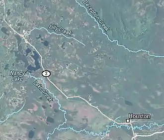 Excerpt from a USGS map showing Nancy Lake and adjoining streams in the upper left, and the nearby town of Houston, Alaska, in the bottom right