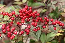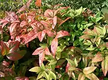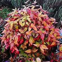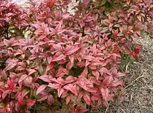 Nandina domestica (/nænˈdnə/ nan-DEE-nə)[lower-alpha 1][lower-alpha 2][lower-alpha 3] commonly known as nandina, heavenly bamboo or sacred bamboo, is a species of flowering plant in the family Berberidaceae, native to eastern Asia from the Himalayas to Japan. It is the only member of the monotypic genus Nandina. It is widely grown in gardens as an ornamental plant with a number of cultivars that display bright-red fall foliage in the cool months, and attractive new foliage growth in spring. Although a popular ornamental shrub, the berries are toxic to birds,[2] especially towards the end of the winter when other food sources become scarce.[3]