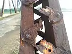 In October 2000, flooding caused the collapse of the western part of the bridge,[5] leaving three trusses. These trusses are corroded, with many of the struts heavily pitted or completely rusted through. Concerns over the potential for collapse of the remains have prompted discussions over whether it should be dismantled. Local residents and others wish to preserve it as a historical monument.[6][7][8]
