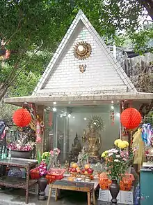 Thai people like to have a figurine or cloth poster (called a Pha Yant, or Yantra Cloth) of the goddess in their home or shop, where it is often placed by the shrine. Many people in Thailand, who travel around to sell their wares, wear amulets with her figure around the neck.