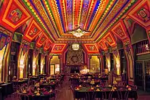Design elements include architectural features such as polygonal towers, cedar shakes, a gambrel roof pierced by dormers, and French doors topped by sashes with pointed crowns. The Cree theme of the lodge is displayed in the common room, which has a 200-short-ton (180 t) native rock fireplace about 12 feet (3.7 m) high. Inset above the hearth is a native welcome symbol in the shape of a sunburst, made of the same water-rounded stone used in the fireplace. The chamber's walls and ceilings were painted by the artist Antoine Gouffe (who was of French descent and studied art in Paris) with other native-inspired designs[3][5] and have been called a "psychedelic marriage of Art Deco and traditional Cree Indian patterns".[2][8]