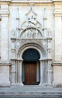 In 1432–1435 he worked on the main entrance portal for the Basilica of Saint Nicholas of Tolentino, with an architectural framework that is "a strange mixture of Romanesque and Gothic motifs",[23] not to mention classicizing Renaissance ones, with sculptures of Saint George and the Dragon above the Virgin and Child flanked by two saints. At each side, a saint or prophet stands singly at each of four levels. The Saint George seems to draw on a classical model.[24]