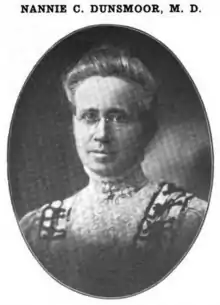 Nannie C. Straus Dunsmoor (November 17, 1860 – July 18, 1941) was an American medical doctor and one of the first woman to be a medical doctor in California. [1] She continued to practice into her 80s. She was the oldest active member in the United States of the Soroptimist Club.