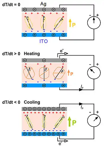 The working principle for the first case is explained by the primary pyroelectric effect, which describes the charge produced in a strain-free case. The primary pyroelectric effect dominates the pyroelectric response in PZT, BTO, and some other ferroelectric materials.[69] The mechanism is based on the thermally induced random wobbling of the electric dipole around its equilibrium axis, the magnitude of which increases with increasing temperature.[70] Due to thermal fluctuations at room temperature, the electric dipoles will randomly oscillate within a degree from their respective aligning axes. Under a fixed temperature, the total average strength of the spontaneous polarization from the electric dipoles is constant, resulting in no output from the pyroelectric nanogenerator. If we apply a change in temperature in the nanogenerator from room temperature to a higher temperature, the increase in temperature will result in the electric dipoles oscillating within a larger degree of spread around their respective aligning axes. The total average spontaneous polarization decreases due to the spread of the oscillation angles. The quantity of induced charges in the electrodes is thus reduced, resulting in a flow of electrons. If the nanogenerator is cooled instead of heated, the spontaneous polarization will be enhanced since the electric dipoles oscillate within a smaller degree of spread angle due to the lower thermal activity. The total magnitude of the polarization is increased, and the amount of induced charges in the electrodes is also increased. The electrons will then flow in the opposite direction.
