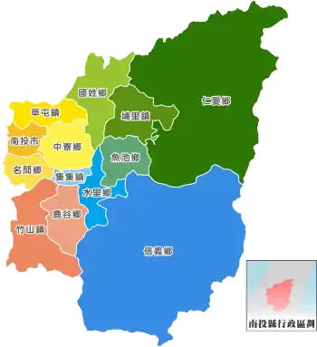 Nantou County consists of 1 city, 4 urban townships, 6 rural townships, 2 mountain indigenous townships, 128 villages and 133 neighborhoods.[7][8][9] Nantou City is the seat of the county which houses the Nantou County Government and Nantou County Council. The incumbent Magistrate of Nantou County is Lin Ming-chen of the Kuomintang.