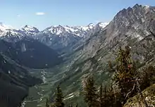 The Napeequa Valley continues southeast from Twin Lakes but it occupied by Big Meadow Creek, a tributary of the Chiwawa River. Big Meadow Creek was probably once a tributary of the Napeequa but was captured by the Chiwawa.[2] The Napeequa Valley has been compared to the fabled Shangri-La.[3] The valley is part of the Glacier Peak Wilderness.47°55′15″N 120°53′47″W / 47.92083°N 120.89639°W[4]