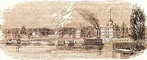 The leaders of Napoleon were ambitious, not only did they create a town with a large wharf, they lobbied to be the location of one of the Federal Marine Hospitals and aspired to a to build a railroad linking Napoleon to the Pacific Ocean.[2] Despite such aspiration the town quick established a sour reputation for filth, bugs and crime. U.S. Supreme Court Justice Peter Vivian Daniel wrote to his daughter about his visit to Napoleon in 1851 calling it a "miserable place [that] consists of a few slightly build wood houses, hastily erected no doubt under some scheme of speculations, and which are tumbling down without ever having been finished…"