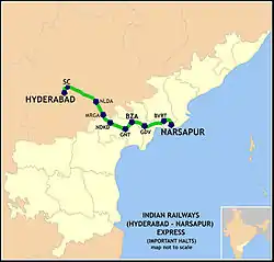 Narsapur Express Train.No.17255/17256 Narasapur-Hyderabad is a Daily Train. Narsapur Express is one of the busiest trains, running with 23 coaches at full capacity at all times. It has 19 halts and 79 intermediate Stations between Hyderabad Deccan Nampally and Narasapur. Narsapur Express is considered to be one of the most prestigious trains of South Central Railway(SCR) which connects the Telangana state capital city of Hyderabad with the Narasapuram town of Andhra Pradesh and is operated with 17255/17256 as train numbers. The train is considered the best way between the two cities and coaches is maintained very neatly by the South Central Railway.