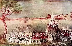 In Terwiel's analysis of the other accounts, however, the Burmese crown prince and Naresuan both fought on their war elephant in the battle, although no formal duel probably ever took place. Per Terwiel, it is highly unlikely that Swa would have agreed to a formal duel since agreeing to do so would have "jeopardized the costly invasion that had thus far progressed without a hitch."[19] During the battle, Naresuan's elephant got surrounded by the Burmese forces. During that crucial moment, a Burmese war elephant went musth, and attacked Swa's elephant. Seeing that Swa was in difficulty, Naresuan "closed in, and he (or one of the warriors riding with him, maybe a Portuguese) fired a gun which mortally wounded the crown prince" Swa.[20] Naresuan was "lucky to escape from a very dangerous situation" but also quick to take advantage of it.[21] According to Terwiel, the "Burmese and European accounts stayed closer to what actually may have happened", and "Naresuan's much repeated challenge to hold a duel, even though it looms large in many Thai history books, should be relegated to a legendary tale."[20]