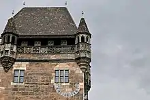 The name "Nassauer Haus" is the name in use for the corner house only since the 19th century and is based on an erroneous reference to the German king Adolf von Nassau († 1298). Until then, the building was referred to (since the early 18th century) as Schlüsselfelderisches Stiftungshaus..[1] However, descendants of the king from the count's House of Nassau had possessions further north of the Lorenzkirche in the 15th century.[2]
