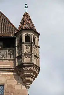 According to the latest knowledge, the following coats of arms are attached to the house (starting from the southwestern bay window): Archduchy of Austria, the large city arms of Nuremberg, County of Cilli, Electorate of Trier, Electorate of Cologne, Electorate of Mainz, Roman King, Pope Eugene IV, Holy See, city of Rome, Roman Emperor, Kurbohemia, Electoral Palatinate, Kursachsen, Kurbrandenburg, St. Lorenz, the small city arms of Nuremberg, the coat of the Ortlieb. With its coat of arms decoration, the Nassau House possesses the earliest example of the two city coats of arms, as well as of the coexistence of royal and (double-headed) imperial eagle.[4]