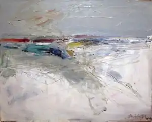 Oliveira established an early reputation for his depictions of isolated figures painted in an improvisational style. Over time his subjects and style varied tremendously, as he created images of animals, birds of prey, human heads, masks, nudes, and still lifes of fetish objects. Oliveira also developed a series of "sites" that told the story of an invented culture with shamanic characteristics.[6] Most of the artist's paintings are either vividly colored but somber human figures, or abstract expressionist works that vaguely resemble seascapes.[7] Sea from 1959, in the collection of the Honolulu Museum of Art, is an example of these almost abstract seascapes.