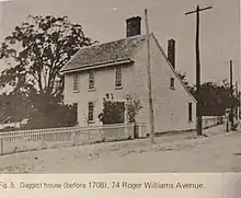 The rather sentimental, nostalgic association of the house with the region's early history, particularly with the settlement planted by Roger Williams a short distance to the north, made the structure the focus of an early historical-preservation campaign. In the 1890s the Daggett House was threatened with demolition to permit realignment of Roger Williams Avenue to accommodate a streetcar line. The scheme caused such consternation that the Rhode Island Historical Society formed a committee of prominent area scholars and businessmen to work for preservation of the structure. The house was saved, but underwent extensive changes to adapt it for use as a workers’ tenement. Today, the Daggett house's status as a historical and cultural artifact and architectural relic make it one of East Providence's more important historical resources.[2]