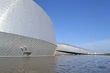 Den Blå Planet opened in 2013 in Kastrup, a suburb of Copenhagen.[1] It resembles a whirlpool when seen from above; it often is, being close to the Copenhagen Airport. It was designed by Danish architects 3XN.[2][5] To reduce energy consumption the building is equipped with cooling units using seawater from Øresund and double glazing.[6] It covers a total of 12,000 m2 (130,000 sq ft), including the 10,000 m2 (110,000 sq ft) building and 2,000 m2 (22,000 sq ft) outdoors (excluding parking spaces).[3]