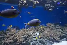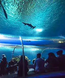 This section contains the largest aquarium in Blue Planet, the 4,000,000-litre (880,000 imp gal; 1,100,000 US gal) Ocean tank.[1] It is home to sharks (zebra shark, blacktip reef shark, wobbegongs and scalloped hammerheads), stingrays, eagle rays, guitarfish, moray eels, golden trevallies, groupers and more that can be seen through the 16 by 8 m (52 by 26 ft) main window, which is 45 cm (18 in) thick. There is also a 16 m (52 ft) long shark tunnel.[20][21][22] Opposite the Ocean Tank is the 16 m (52 ft) long coral reef with living corals and reef fish.[23] There are also various smaller aquaria with species such as shrimpfish, seahorses, a Mediterranean aquarium,[10] and the highly venomous stonefish and lionfish.[24][25]
