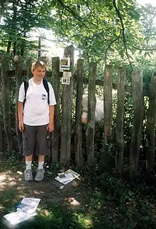 The National Blue Trail (in Hungarian: Országos Kéktúra, short: OKT) is a national trail in Hungary, for most of its length part of the European Long Distance Walking Route E4. The route starts atop the Írott-kő Mountain (884 m) on the Austrian-Hungarian border then leads across Hungary eventually ending 1,170 km later at the village of Hollóháza by the Hungarian-Slovakian border. (Interactive map). The name of the Kéktúra (Blue Trail) is a reference to the marking of the path itself: it is a horizontal blue stripe on a white rectangle. All segments of the trail are freely accessible to the public; no fees have to be paid or permits obtained, there is only one ferry to take over the Danube between Visegrád and Nagymaros where you have to purchase a ticket. Although to have an official completion, you have to purchase a stamping brochure from MTSZ, the organizer of the trail.