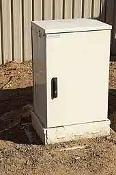 An NBN fibre-to-the-node cabinet, located near a distribution area pillar